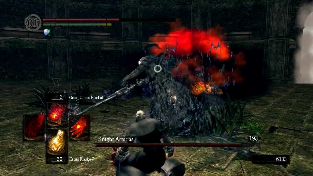 When Oolacile woke Manus, Manus’ influence corrupted the citizens of Oolacile against their will and made them the forces of the Abyss. Artorias, accompanied by Sif, arrived there to save Oolacile as well as Princess Dusk, who was captured from the present day. However, the two were overrun by the creatures of the Abyss. Artorias sacrificed himself to protect Sif using his greatshield to raise a barrier around the wolf pup. Defeated by the Abyss, the knight became corrupted against his will. His already-cursed sword became corrupted by the Abyss as well. But even with one arm broken, Artorias is still a formidable swordsman (some of his technique is later used by Sif in Sif’s boss fight), as you will find later when you fight him before entering Oolacile Township.