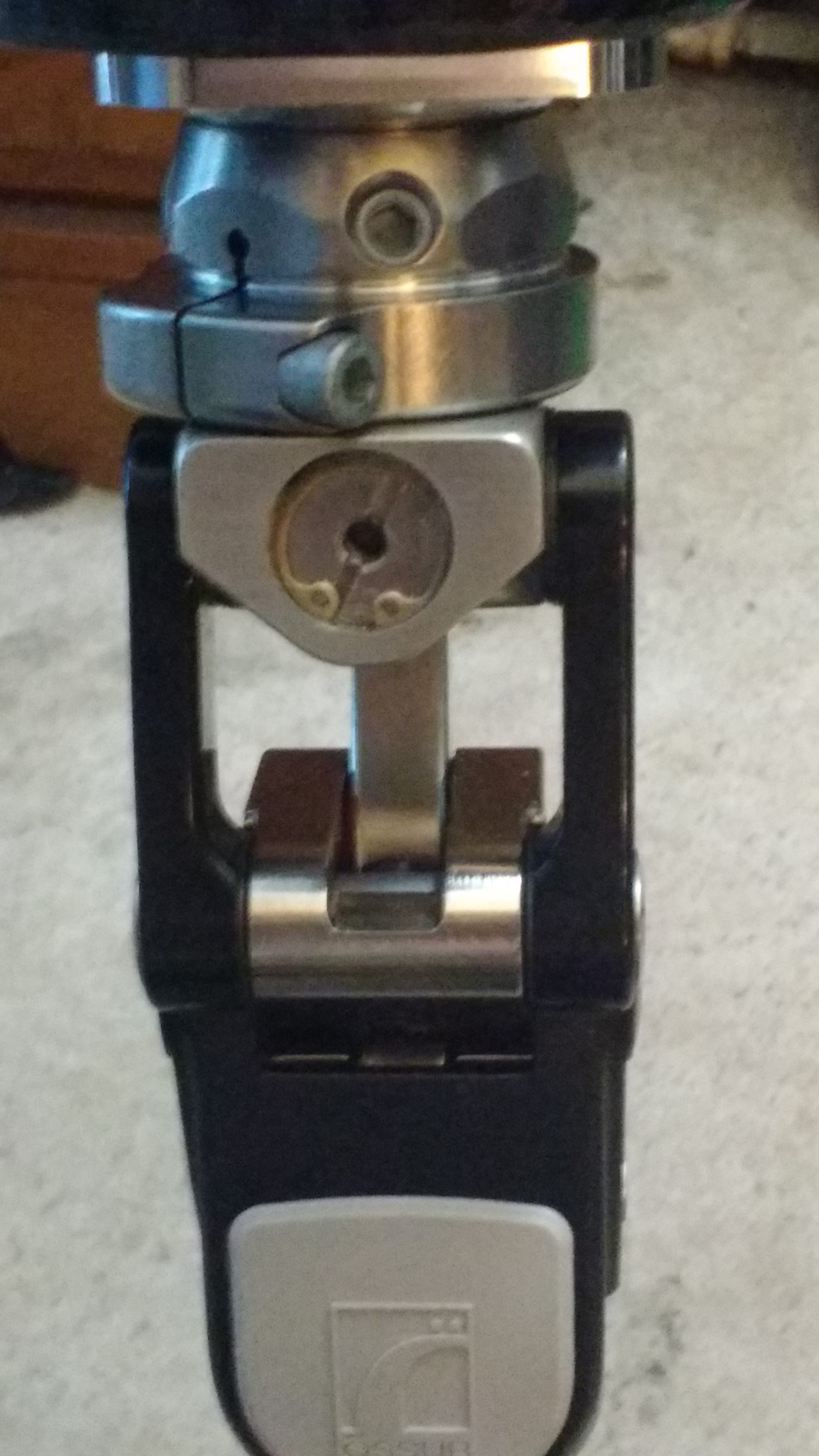 The knee is a sorta crescent shaped guide atop the leg-post that attaches to the thigh-cup, w two interlocked hinges, which place it’s pivot point somewhere just behind the lower thigh, and allows the leg to effectively shorten on the swing of a step. When the leg is straight, with weight on the heel, the knee locks for stability. When pressure is put on the toe of the prosthetic, the knee unlocks and allows the leg to swing back as it is brought forward and down, if that makes sense…