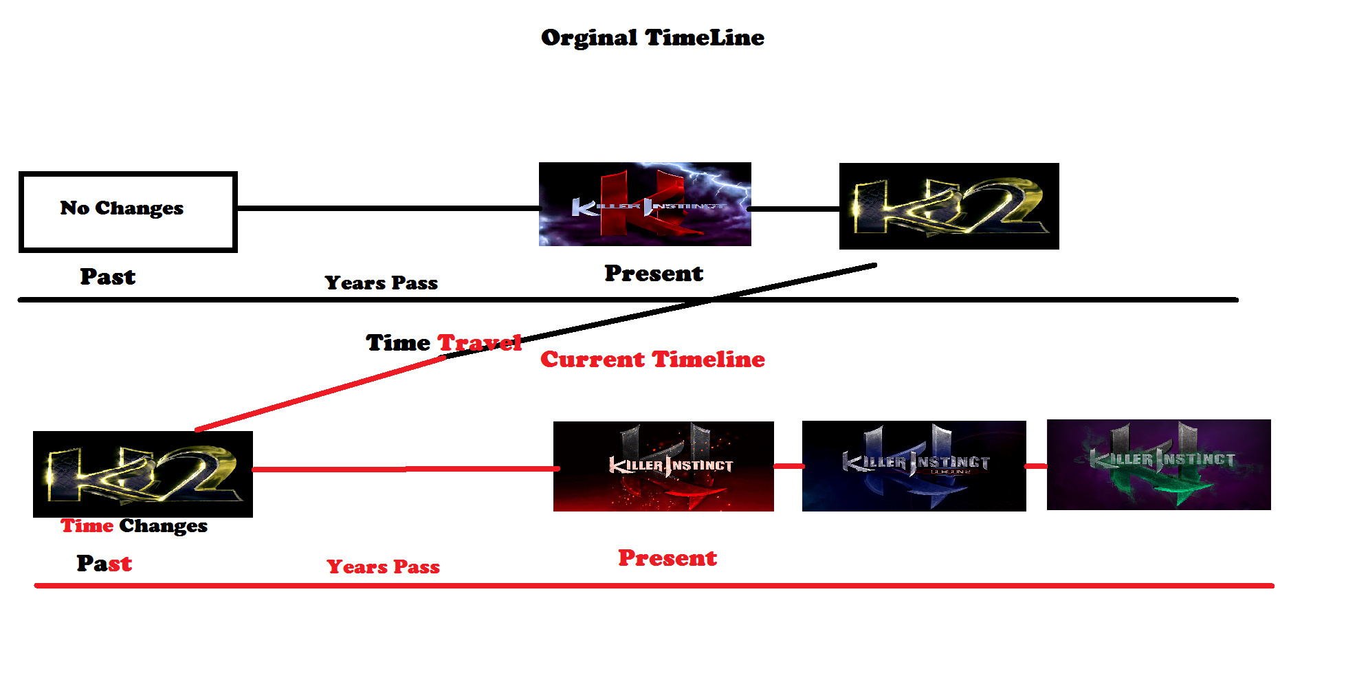 So 1st we have the Original Killer Instinct Then we have Killer Instinct 2/Gold, Now in KI2 there was time travel so characters went back in time. Now this is where the connection happens because of the characters being back in time events would have changed and because events changed this would course a ripple effect/Butterfly effect all through time changing events creating a completely new Univers/Timeline and this is the Timeline where the current game takes place so many years later.