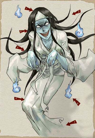 Since Hisako is a) Japanese, and b) dead, it seems fitting to give her an outfit that’d be traditionally worn on the dead. This can be seen on other onryos in pop culture, such as Kayako (Ju-On: The Grudge) and Sadako (Ringu).