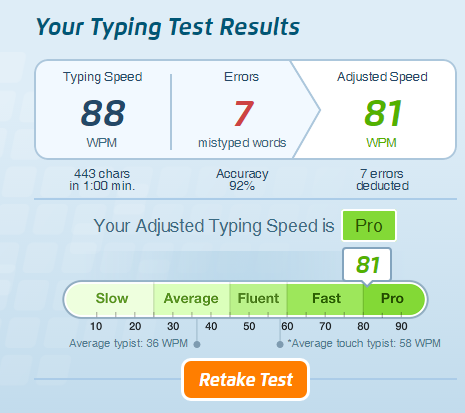 Taking it again after waking up I got 89, a bit closer to what I expected. Still, I tend to peek at my hands while typing since I’m not the best touch typist.