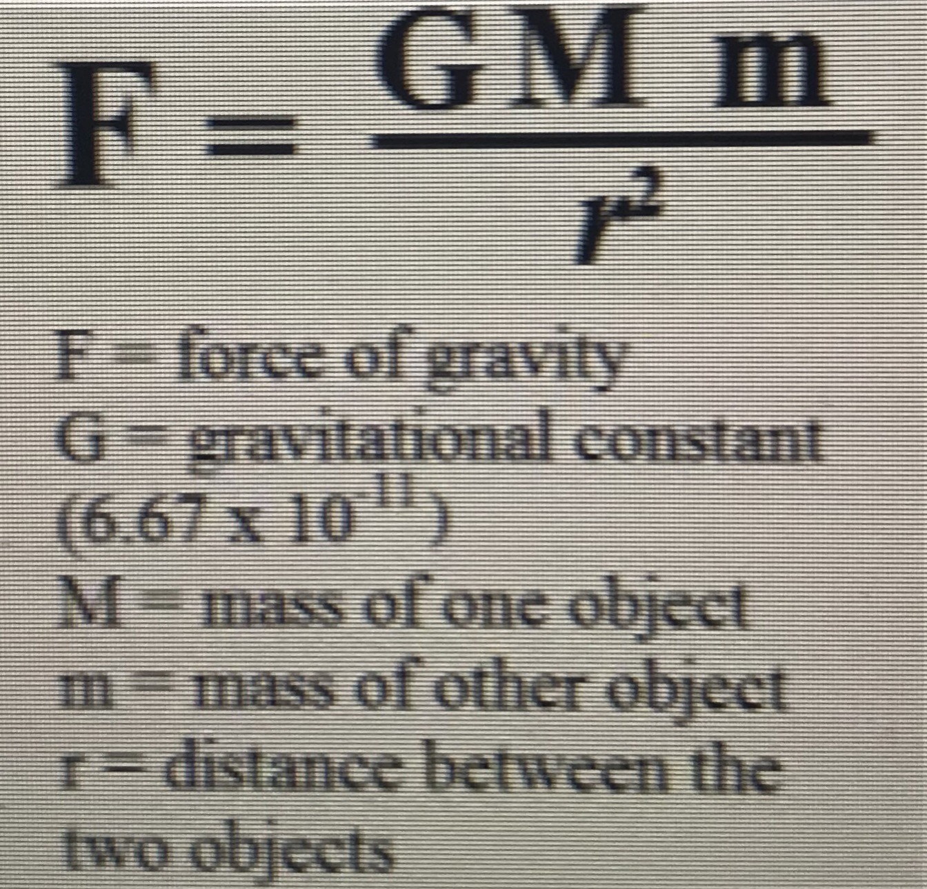 Wait, isn’t r between the centers of the two objects, so you have to add ~4,000 miles for the radius of the Earth? I didn’t have the sense of scale that you’re only 5% farther from the center of the Earth on the ISS, so your weight is 1 / (1.05^2) = 90.7% of your weight on the surface. Holy crap!