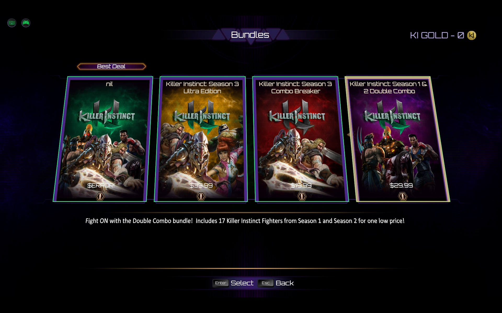 Okay, so I just read on the forum that someone figured out a work around to nil $error/unable to purchase bundles and decided to try it myself and it sorta works. To do so you go into single player and select any character that is currently not free you will be greeted with a pop up menu letting you purchase the character or the associated bundle EXCEPT the Supreme bundle which is frustrating as that’s the better value and the one I want.