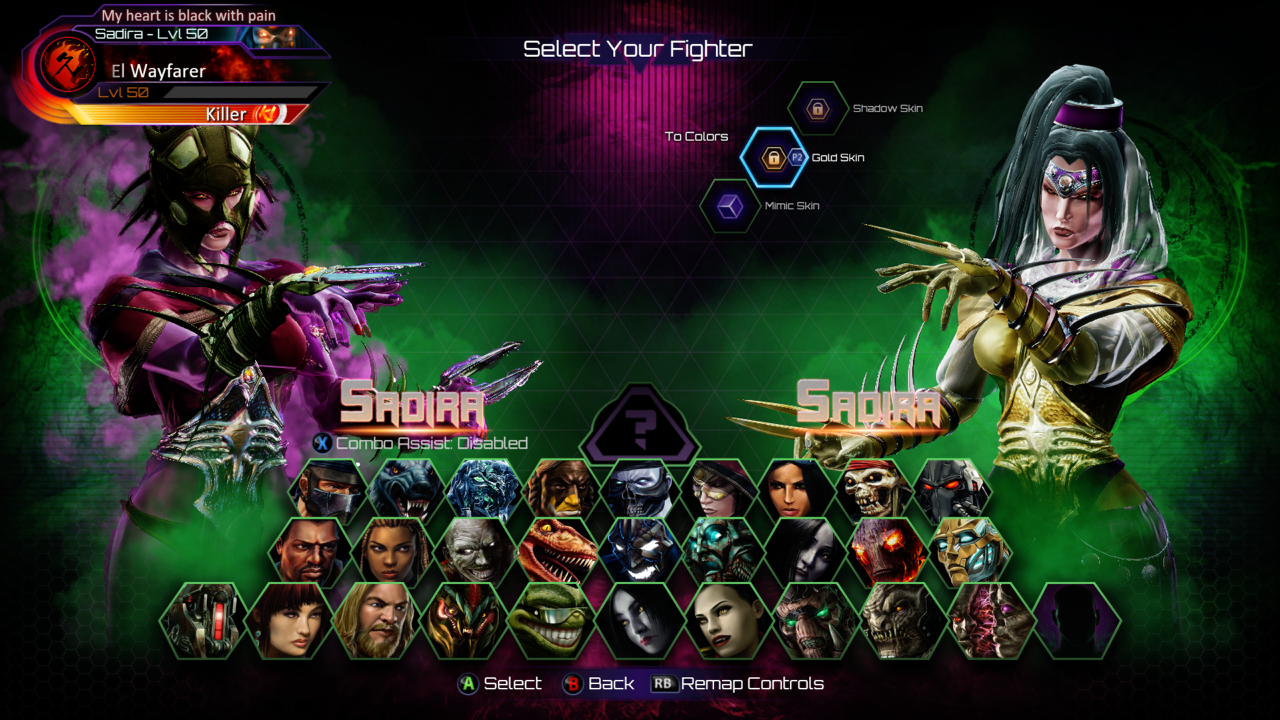 Forgot to add this bug. Sadira’s Genie and Witch Doctor Head accessories do not match with Mimic, Shadow or Gold skins. Her face stays in the same skin color as her default but the rest of her body changes color accordingly. Her Masquerade Mask is fine. This glitch is similar to T.J Combo’s glitch in the beginning