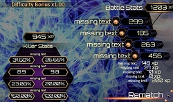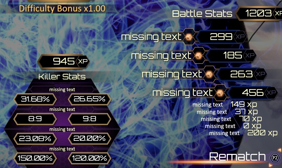 Iām playing Exhibition matches with a friend. Every match on the outro stat screen the 4 main stat categories in the middle and categories on the right show up as āmissing textā. This doesnāt usually happen when playing offline. Doesnāt happen for the other player though. Also Shadow Efficiency is still often showing values above 100%