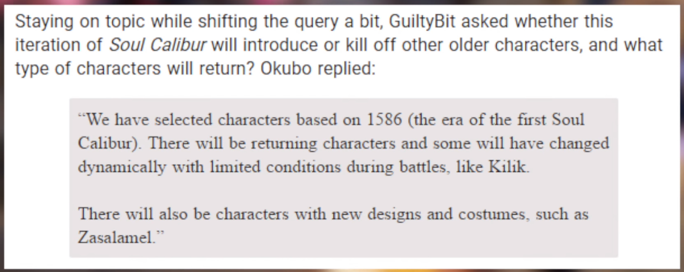 but I wouldn’t give up hope yet. Soul Calibur VI story details haven’t been completely revealed. I’m sure we will see Cassandra and Raphael for sure. Talim is likely as well.