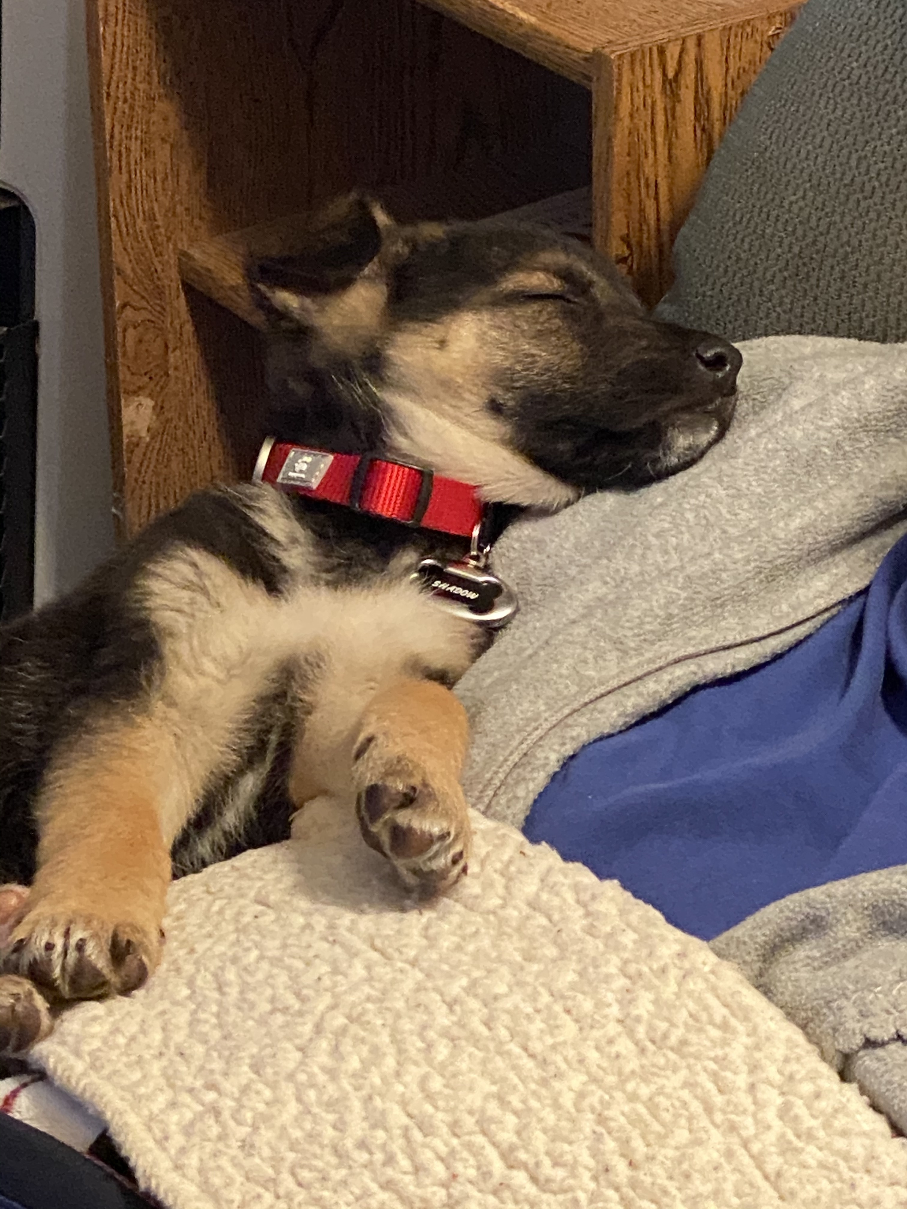 He’s sleeping on my mom, who has been puppy sitting for me while I’m at work.